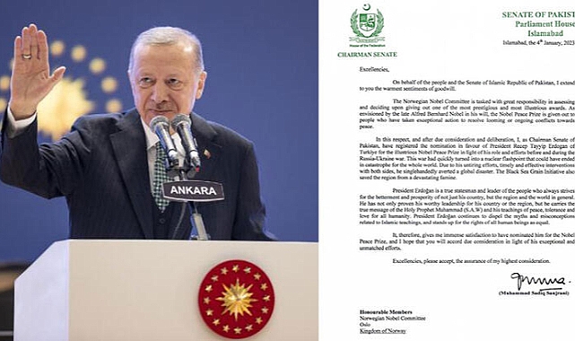 Cumhurbaşkanı Recep Tayyip Erdoğan'ın, Nobel adaylığı için ilk destek, Pakistan Senato Başkanı Muhammed Sadig Sanjrani'den geldi.