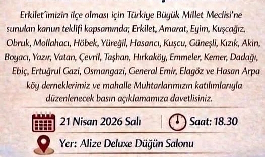 Kayseri’de, geçmişte belde statüsünde bulunan ancak büyükşehir yasası sonrası mahalleye dönüştürülen Erkilet bölgesinin yeniden ilçe statüsüne kavuşması için girişimler sürüyor. Bu kapsamda, bölgede bulunan 30 kırsal mahalle muhtarı ile köy dernekleri 21 Nisan Salı günü ortak bir toplantı gerçekleştirecek
