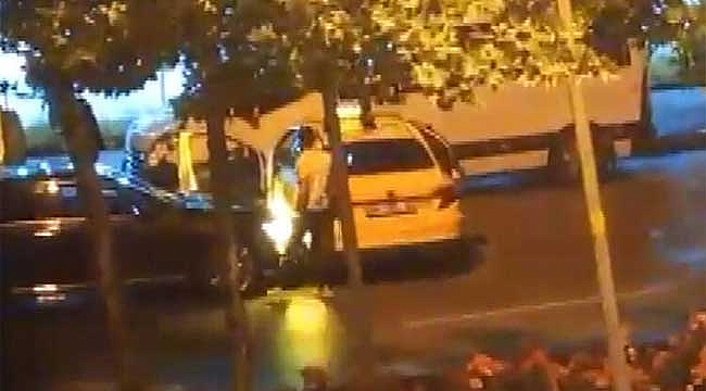 ÇARPARAK DURDURDU, ÜZERİNE ÇIKIP ZIPLADI Çevredekiler dehşete düşüren saldırı olayını cep telefonu kamerasıyla kaydetti. Görüntülerde saldırganlar taksiyi çarparak durdurduğu görülüyor. Saldırganlardan birisinin taksinin üzerine çıkıp zıplamaya başlıyor. Diğer saldırgan ise taksi şoförüne hakaret ediyor. Taksicinin polisi aradığını gören saldırgan, şoförün peşinden koşup, tartaklamaya başlıyor. Şüpheliler korkudan taksinin içinde saklanan kadına yeniden saldırıyor. Olay yerine gelen polis ekipleri, iki şüpheliyi ifadelerini almak üzere karakola götürdü. Kadın, sağlık görevlilerinin müdahalesi sonrası ambulansla hastaneye kaldırıldı. Taksi şoförü ise ayakta tedavi edilerek evine gönderildi. Kadın ve taksi şoförünün şikayetçi olduğu saldırganlar, emniyetteki işlemlerinin ardından adliyeye sevk edildi. Şüpheliler çıkarıldıkları mahkeme tarafından serbest bırakıldı.