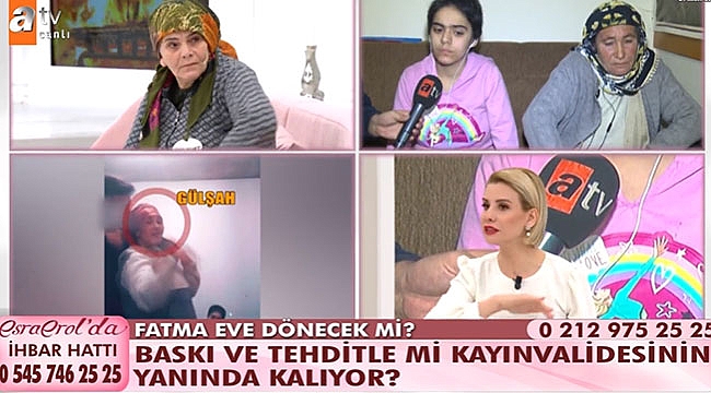 ATV ekranlarının reyting rekortmeni programı Esra Erol'da her hafta birbirinden ilginç konu ve konuklarla gündemi belirliyor. Daha önce yaşadıklarıyla yürekleri burkan Fatma, geçtiğimiz gün yeniden Esra Erol'a katılarak anlattıklarıyla izleyenleri şaşkına çevirdi.. Kuması ve eşiyle aynı evde yaşayan Fatma, Ahmet ve Ahmet'in annesi tarafından şiddet görmüş ve saçları kısacık kesilmişti. Kızı için endişelenen Melahat Oruç, Esra Erol'a katılarak kızının Ahmet'ten gördüğü şiddet nedeniyle bebeğini kaybettiğini ifade etti. İddiaların ardından canlı yayına katılan Fatma'yı gören annesi gözyaşlarına hakim olamayarak "Ağlama dik dur. Ağlama kızım seni çok seviyorum" dedi. Fatma ise, "Evime dönmek istemiyorum. Benim kanamam olduğu için hastaneye gittim.