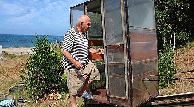 Demirkol, eğimli araziden geçerek 1 dakikalık yolculukla tepedeki evine inip çıkıyor. Yük de taşınabilen raylı sistemi eve gelen misafirler de kullanıyor.
