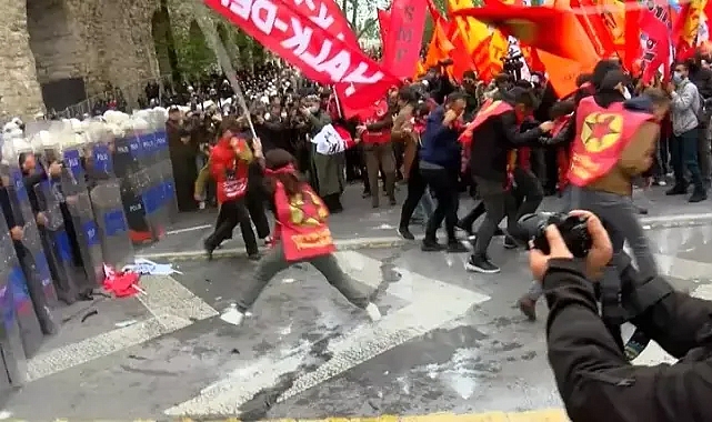 Saraçhane'den Taksim'e yürümek isteyen grup, Unkapanı'ndaki Bozdoğan Kemerleri altında polisle karşı karşıya geldi. Grup barikatı aşmaya çalışırken, polis biber gazı ve plastik mermi ile müdahale etti. Arbede sırasında iki kişinin polise damacana ile vurduğu görüldü.