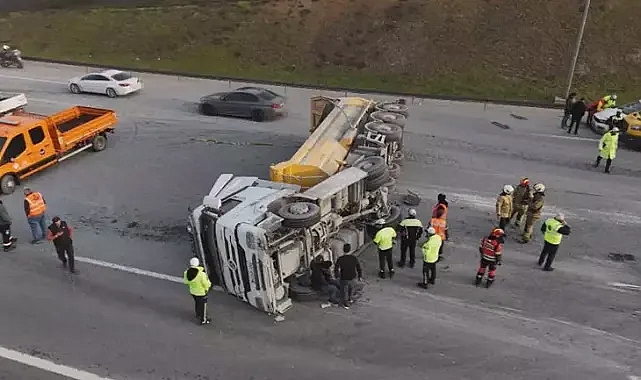 Eyüpsultan TEM Otoyolu'nda hafriyat kamyonu devrildi; yoğun trafik oluştu
