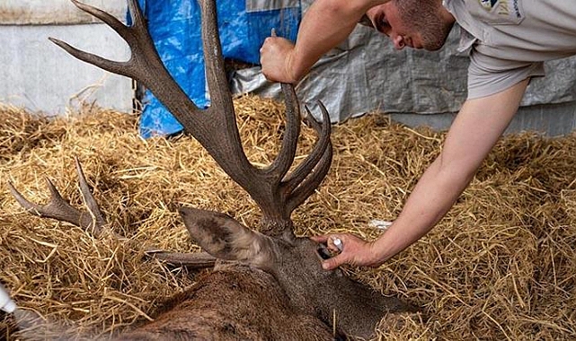 Kemalpaşa Organize Sanayi Bölgesi'ndeki (OSB) yedek makine parçaları üreten bir fabrikanın bahçesinde 7 Ekim'de yaralı halde bir kızılgeyik bulundu. İhbar üzerine Doğa Koruma ve Milli Parklar Şube Müdürlüğü ekipleri tarafından alınan geyik ilçedeki bir barınağa ardından da İzmir Büyükşehir Belediyesi'ne bağlı Doğal Yaşam Parkı'na getirildi. Burada tedavi altına alınan geyiğin tüfekle sol ön ayağından vurulduğu ve ayağında kırık olduğu belirlendi. Yaklaşık 1,5 yıldır bu şekilde doğada yaşadığı tahmin edilen erkek kızılgeyiğin önümüzdeki hafta operasyona alınacağı belirtildi. BAKAN YUMAKLI AÇIKLAMA YAPTITarım ve Orman Bakanı İbrahim Yumaklı dün sosyal medya hesabından DHA'nın haberini alıntılayarak yaptığı paylaşımda, geyiğin sağlık durumunun iyiye gittiğini belirterek, “Bir süre daha misafirimiz olarak gözetim altında kaldıktan sonra doğal yaşam alanına kavuşacak" ifadesini kullandı. 'AYAĞINDAKİ SAÇMALAR ÇIKARILACAK'İzmir Büyükşehir Belediyesi Veteriner İşleri Halk Sağlığı Daire Başkanlığı'na bağlı Veteriner Hekim Şükrü Erdem Onur, "Yaralı kızılgeyik bize getirildi ve hemen anesteziye alıp tedaviye başladık. Röntgen çekildi. Ayakta kırık olduğunu gördük. Yine ateşli silahla yaralanma sonucu ayağında çok sayıda saçmanın olduğunu da tespit ettik. Ayağı çok kötü durumdaydı. Her iki tarafta tenis topu büyüklüğünde çıkıntılar var. Bunların kemik üremesine bağlı olduğunu düşünüyoruz" dedi. 4- 5 yaşlarında olduğu tahmin edilen geyiğin, önümüzdeki hafta ortopedi operasyonuna alınacağını vurgulayan Onur, "Hayvanı anesteziye alıp ortopedi operasyonu yapacağız. Zorlu bir operasyon olacak. Yaklaşık 1,5 yıldır bu şekilde doğada yaşadığını tahmin ediyoruz. Kızılgeyiği, sağlığına kavuşturup yeniden doğal yaşam alanına bırakmak istiyoruz. Veteriner hekimler olarak bunu başarabilirsek çok sevineceğiz" diye konuştu.