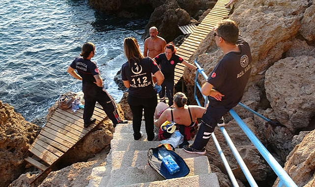 Antalya'da falezler üzerindeki merdivenden denize inmek isterken dengesini kaybedip kayalığa düşen Rus uyruklu kadın, ekiplerin ve vatandaşların çabasıyla 1,5 saatte kurtarılıp hastaneye götürüldü.