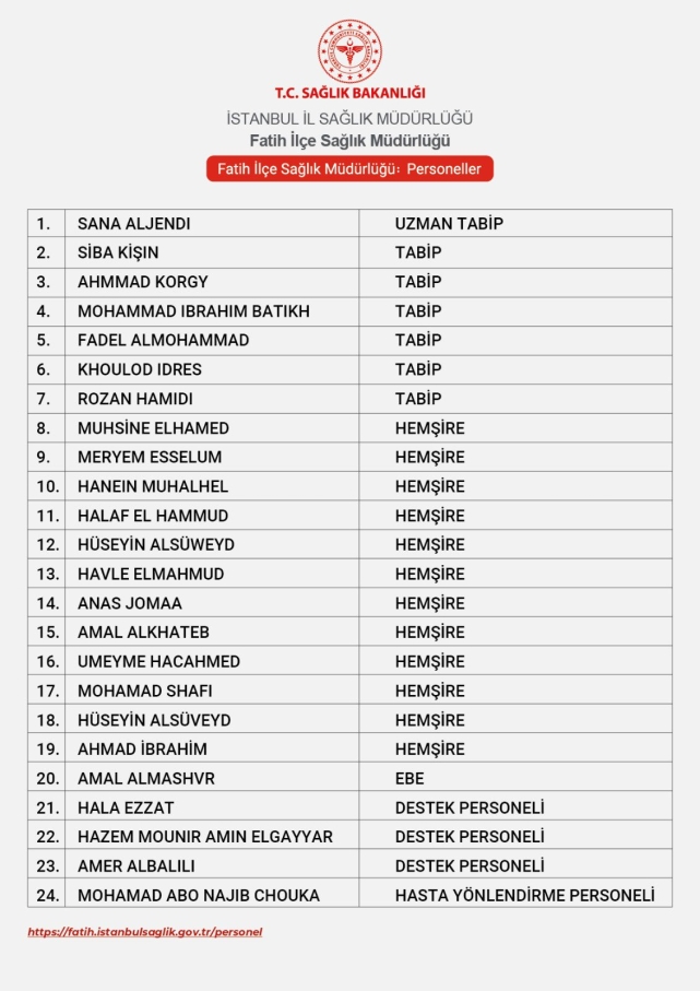 Fatih İlçe Sağlık Müdürlüğü, sosyal medyada paylaşılan personel listesi ile ilgili açıklama yaptı. Açıklamada şu ifadelere yer verildi:"Geçtiğimiz günlerde sosyal medya mecralarında bahsi geçen ve T.C. Sağlık Bakanlığı İstanbul Fatih İlçe Sağlık Müdürlüğü web sayfasından alındığı belirtilen 24 kişilik yabancı uyruklu çalışan listesi, SIHHAT Projesi kapsamında ülkemizde “Geçici Koruma altında olan sığınmacılara ve diğer statüdeki yabancılara sağlık hizmeti vermek amacıyla açılan Göçmen Sağlığı Merkezi bünyesinde hizmet veren proje personelini göstermektedir.Proje kapsamında görevli bu kişiler, görev süreleri proje süresi ile sınırlı olacak şekilde 4857 sayılı İş Kanunu kapsamında 'Belirli Süreli İş Sözleşmesi' ile çalışmakta olup, kamu işçisi ya da kamu personeli statüsünde değildir. Göçmen Sağlığı Merkezlerinde yabancılara çalışma izni T.C. Çalışma ve Sosyal Güvenlik Bakanlığı Uluslararası İş Gücü Genel Müdürlüğü tarafından verilmekte, gerekli güvenlik soruşturmaları yapılmakta ve ilgili yasal düzenlemeler kapsamında ancak çalışma izni onaylanmış yabancı uyruklular istihdam edilebilmektedir. Güvenlik soruşturmasından geçmemiş kimse çalıştırılmamaktadır. Yabancı uyruklu personelin çalışma izinleri ise her yıl ilgili mevzuat kapsamında yeniden değerlendirilmektedir.Göçmen Sağlığı Merkezlerinde sadece yabancılara hizmet verilmektedir. Göçmenlerin aldığı sağlık hizmetleri ile vatandaşlarımızın aldığı sağlık hizmetleri ayrıştırılmıştır. Sağlık hizmetlerinden vatandaşlarımızın faydalanmasında göçmenlerin ek bir yüke sebep olmaması için alınan tedbirleri başka yönlere çekmek insaf ve vicdan sınırlarının dışındadır."