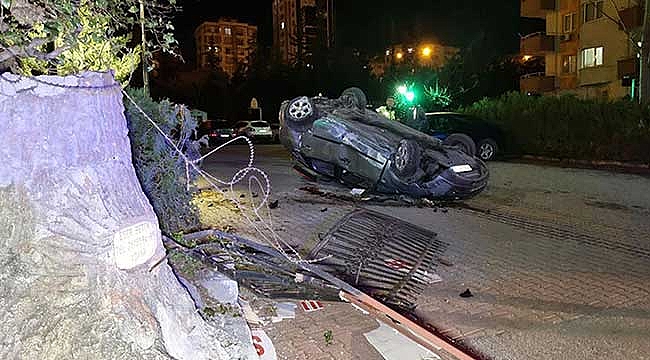 Feci kazada demir korkuluklara çarpan otomobil devrildi