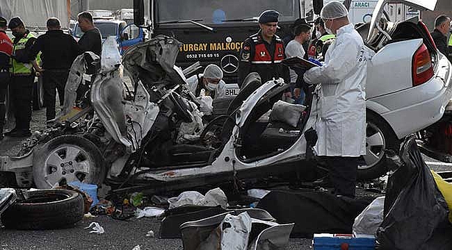 Ordu'nun Perşembe ilçesinde aşırı hız nedeniyle kontrolden çıkan otomobil, park halindeki TIR'ın önünde duran sürücüsü Ahmet Karatekin'e çarptı. Kazada hurdaya dönen otomobildeki Mahmut (63) ile eşi Selma Öztürk (63), hayatını kaybederken, TIR sürücüsü Karatekin'in ise bacağı koptu.