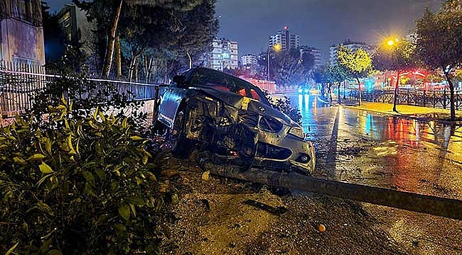 Adana'da direksiyon kontrolünü kaybeden sürücü, lüks otomobil ile otobüs durağına dalıp, aydınlatma direğini ve bir ağacı devirdikten sonra aracını bırakıp, kaçtı.