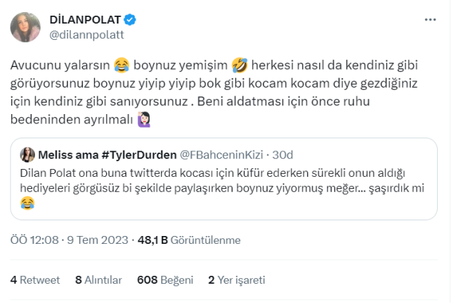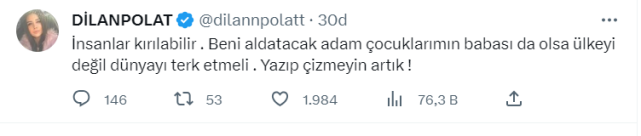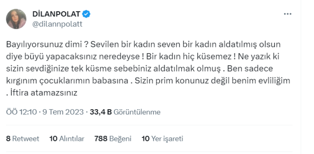 Lüks yaşantısıyla sosyal medyada en çok konuşulan isimlerin başında gelen Dilan Polat, eşi Engin Polat ile ayrıldığı iddiası gündeme bomba gibi düştü. İddiaların odağındaki Dilan Polat o iddiaya sosyal medya hesabından yanıt verdi. Dilan Polat Twitter hesabından yaptığı açıklamada:" İnsanlar kırılabilir . Beni aldatacak adam çocuklarımın babası da olsa ülkeyi değil dünyayı terk etmeli . Yazıp çizmeyin artık ! Bayılıyorsunuz dimi ? Sevilen bir kadın seven bir kadın aldatılmış olsun diye büyü yapacaksınız neredeyse ! Bir kadın hiç küsemez ! Ne yazık ki sizin sevdiğinize tek küsme sebebiniz aldatılmak olmuş . Ben sadece kırgınım çocuklarımın babasına . Sizin prim konunuz değil benim evliliğim . İftira atamazsınız" dedi.