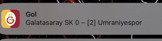 Tam da bu esnada Galatasaray resmi uygulamasından kullanıcılara bir gol bildirimi geldi. Gönderilen bildirimde Ümraniyespor'un 2-0 öne geçtiği görülürken, taraftarlar bu duruma çok sinirlendi.