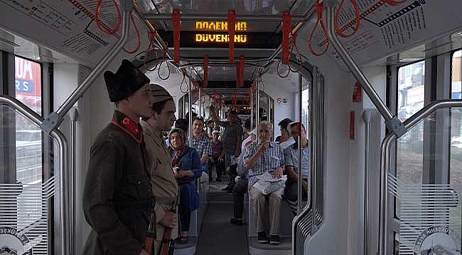 30 Ağustos Zafer Bayramı’nın 100. Yıldönümü etkinlikleri kapsamında seyir halindeki tramvay aracında Kurtuluş Savaşı askerlerini canlandıran Genç KAYMEK öğrencileri, “Bu vatan, toprağın kara bağrında sıra dağlar gibi duranlarındır. Bir tarih boyunca onun uğrunda kendini tarihe verenlerindir” dedi.