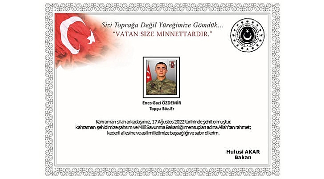 Bakanlıktan yapılan açıklamada, "Birecik/Şanlıurfa hududunda, 16 Ağustos 2022 tarihinde, teröristlerce yapılan havan tacizi sonucunda yaralanarak hastaneye sevk edilen kahraman silah arkadaşımız Topçu Sözleşmeli Er Enes Gazi Özdemir, yapılan tüm müdahalelere rağmen kurtarılamayarak 17 Ağustos 2022 tarihinde şehit olmuştur. Bizleri derin bir acı ve üzüntüye boğan bu olayda hayatını kaybeden aziz şehidimize Allah'tan rahmet, kederli ailesine, Türk Silahlı Kuvvetleri ile asil milletimize başsağlığı ve sabır dileriz" denildi.BAKAN AKAR'DAN BAŞSAĞLIĞIMilli Savunma Bakanı Hulusi Akar, şehit olan Topçu Sözleşmeli Er Enes Gazi Özdemir için yayımladığı taziye mesajında, "Silah arkadaşımız, 17 Ağustos 2022 tarihinde şehit olmuştur. Kahraman şehidimize şahsım ve milli savunma bakanlığı mensupları adına Allah'tan rahmet; kederli ailesine ve asil milletimize başsağlığı ve sabır dilerim" dediYOZGAT'A ŞEHİT ATEŞİ DÜŞTÜŞANLIURFA Birecik'te PKK/YPG'li teröristlerce düzenlenen saldırıda yaralanan ve Ankara Gülhane Eğitim ve Araştırma Hastanesi'ne (GATA) sevki sırasında şehit olan Topçu Sözleşmeli Er Enes Gazi Özdemir'in (22) acı haberi, Yozgat'ın Sorgun ilçesindeki ailesine verildi.Suriye'nin Ayn el- Arab bölgesinden dün sabah PKK/YPG'li teröristlerce Birecik ilçesine bağlı Çiçekalan Hudut Karakolu'na saldırı düzenlendi. Saldırıda yaralanan 5 asker, tahliye edilip, ilk müdahalelerinin ardından helikopterle Şanlıurfa Mehmet Akif İnan Eğitim ve Araştırma Hastanesi'ne sevk edildi. Tedaviye alınan yaralı askerlerden Uzman Çavuş Uğurcan Cirnooğlu dün, Topçu Sözleşmeli Er Enes Gazi Özdemir ise bugün sabaha karşı GATA'ya sevki sırasında şehit oldu. Sağlık ekipleriyle Yozgat Sorgun'daki eve gelen askeri yetkililerden acı haberi alan baba Ali ve anne Ferdane Özdemir, gözyaşı döktü. Şehidin evine ve sokağa Türk bayrakları asıldı.Şehit Enes Gazi Özdemir'in 2 kardeşinin de kendisi gibi sözleşmeli er olduğu; birinin Kuzey Kıbrıs Türk Cumhuriyeti'nde, diğerinin ise Hatay'da görev yaptığı belirtildi. Şehit Özdemir, ikindi vakti ilçede kılınacak cenaze namazının ardından Karşıyaka Mezarlığı'nda toprağa verilecek.