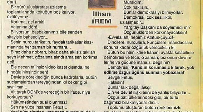 Usta sanatçının ölümünün ardından, Fethullahçı Terör Örgütü (FETÖ) lideri Fethullah Gülen’le ilgili yazısı tekrar gündem oldu.İrem yazısında Gülen'e "Fetuş" diye hitap etmişti. Bunun üzerine dava açan Gülen ise, 1999 yılının parasıyla 1 milyar TL'lik tazminat davasını kazanmıştı.