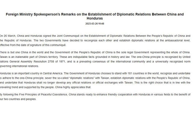 Honduras ve Çin, diplomatik ilişkilerin kurulmasına ilişkin anlaşma imzaladı. Honduras Dışişleri Bakanlığı, Çin ile varılan anlaşma sonrası Tayvan ile diplomatik ilişkileri kestiğini açıkladı.