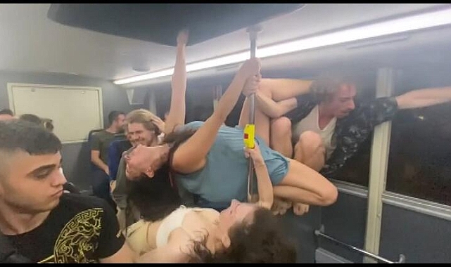 Kadıköy'de çift katlı İETT otobüsünün üst katında yolculuk yapan grup, dakikalarca şarkı söyleyip dans etti. Otobüsteki bazı yolcular grubun dansını şaşkınlıkla karşılarken, bazıları da eşlik etti. Koltukların üzerine çıkan, otobüsün içerisindeki direkte de dans eden grubun eğlencesi kameraya yansıdı.