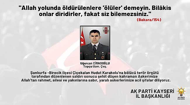Ak Parti Kayseri İl Başkanlığının sosyal medya hesabından yapılan paylaşımda, “Şanlıurfa-Birecik ilçesi Çiçekalan Hudut Karakolu'na bölücü terör örgütü tarafından düzenlenen saldırı sonucu şehit düşen kahraman Askerimize Allah’tan rahmet, ailesi ve yakınlarına sabır, yaralı askerlerimize acil şifalar diliyoruz” denildi.