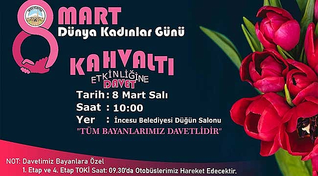 8 Mart Dünya Kadınlar Günü kapsamında düzenlenecek "Kahvaltı" etkinliğine İncesu'lu kadınlar davet edildi. 8 Mart Salı günü yapılacak olan etkinlik saat: 10:00'da başlayacak. İncesu Düğün Salonu'nda yapılacak olan etkinlik için Toki 1. ve 3. etaptan ücretsiz otobüs seferleri yapılacaktır.