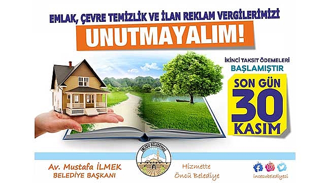 İncesu Belediyesi’nden yapılan duyuru şu şekilde: “Emlak Vergisi ve 2022 yılına ait Çevre Temizlik Vergisi ile İlan Reklam Vergisi'nin 2. Taksit ödeme süresi, bu ay bitiminde yani 30 Kasım 2022 Çarşamba günü mesai bitiminde sona erecektir. Mükelleflerimizin cezalı duruma düşmemeleri için Emlak Vergisi ve İş yerlerine ait Çevre Temizlik Vergisi ile İlan Reklam Vergisi ödemelerini zamanında yapmaları ilanen duyurulur. “