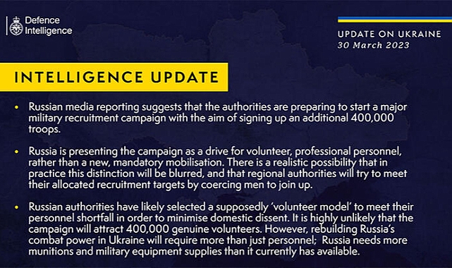 İngiltere Savunma Bakanlığı’ndan yapılan açıklamada, söz konusu ‘kampanyanın’ 400 bin askeri silah altına almayı hedeflediği ifade edilerek, “Yetkililer 400 bin askerin daha silah altına alınması amacıyla büyük bir askere alma kampanyası başlatmaya hazırlanıyor. Rusya bu kampanyayı yeni ve zorunlu bir seferberlikten ziyade gönüllü ve profesyonel personele yönelik bir girişim olarak sunuyor. Rus yetkililer muhtemelen iç muhalefeti en aza indirmek amacıyla personel açığını kapatmak için sözde bir 'gönüllülük modeli' seçmişler. Kampanyanın 400 bin gerçek gönüllüyü çekmesi pek olası değil. Ancak Rusya'nın Ukrayna'daki savaş gücünü yeniden inşa etmek için personelden daha fazlasına ihtiyaç var; Rusya'nın şu anda sahip olduğundan daha fazla mühimmat ve askeri teçhizata ihtiyacı var” denildi.