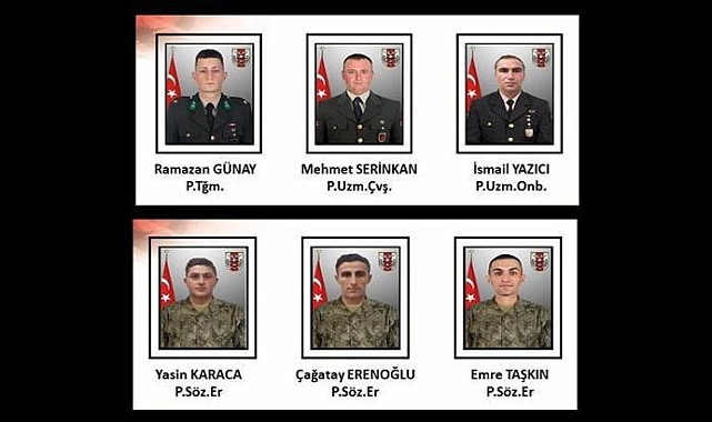 ŞEHİTLERİN KİMLİKLERİ AÇIKLANDIMilli Savunma Bakanı Yaşar Güler, Irak'ın kuzeyinde teröristlerin saldırısı sonucu şehit olan 6 askerin kimliğini açıkladı.Milli Savunma Bakan Yaşar Güler, sosyal medya hesabından yapılan açıklamada, "Piyade Teğmen Ramazan Günay, Piyade Uzman Çavuş Mehmet Serinkan, Piyade Uzman Onbaşı İsmail Yazıcı, Piyade Sözleşmeli Er Yasin Karaca, Piyade Sözleşmeli Er Çağatay Erenoğlu ve Piyade Sözleşmeli Er Emre Taşın. Kahraman silah arkadaşlarımız 22 Aralık 2023 tarihinde şehit olmuşlardır. Kahraman şehitlerimize şahsım ve Milli Savunma Bakanlığı mensupları adına Allah'tan rahmet, kederli ailelerine ve asil milletimize başsağlığı ve sabırlar dilerim" dedi. İZMİR'E ŞEHİT ATEŞİ DÜŞTÜŞehit olan Piyade Teğmen Ramazan Günay'ın (24) acı haberi, İzmir'de yaşayan ailesine ulaştı.