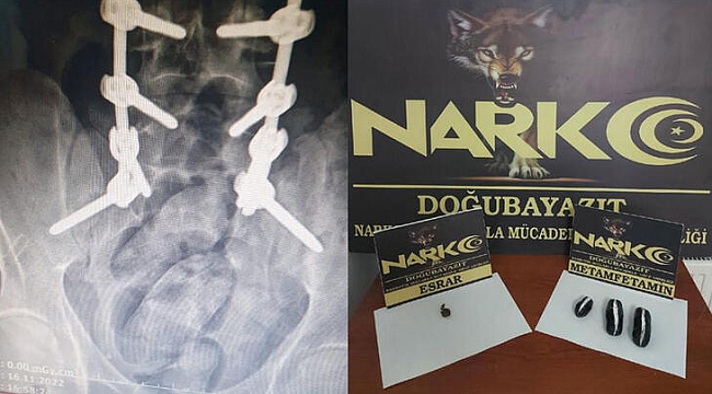 Ağrı Emniyet Müdürlüğü Narkotik Suçlarla Mücadele Şube Müdürlüğü ekipleri, 17 Kasım'da, İran'dan Türkiye'ye giriş yaptığını belirledikleri F.A.'yı Doğubayazıt'ta takibe aldı. Hasankeyf Mahallesi Çevreyolu Bulvarı'nda gözaltına alınan ve Dr. Yaşar Eryılmaz Devlet Hastanesi'nde muayene edilerek röntgen filmi çekilen şüphelinin midesinde, yabancı cisimler tespit edildi. F.A.'ya ilaç verilerek, midesindeki cisimlerin doğal yollarla çıkarılması sağlandı. Yapılan incelemede çıkan cisimlerin; 3 paket halinde 124,9 gram metamfetamin, 4,65 gram reçine esrar olduğu belirlendi. F.A., 'uyuşturucu veya uyarıcı madde ticareti yapma veya sağlama' suçundan sevk edildiği adliyede çıkarıldığı hakimlikçe tutuklandı.