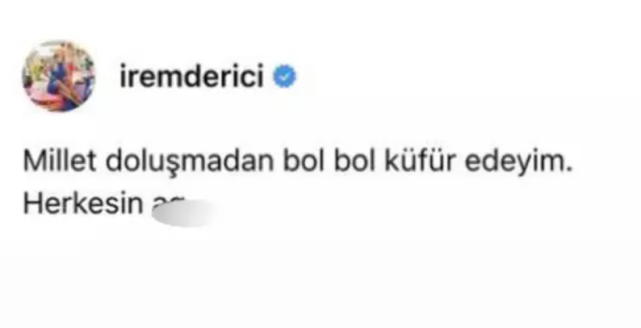Paylaşımlarıyla her zaman olay olan İrem Derici Threads uygulamasına girip küfür edince olan oldu. Elon Musk'ın Twitter'ına rakip olarak piyasaya sürülen Threads uygulaması günü en çok konuşulan başlıkları arasında yer alıncak olanlar oldu. Son dönemde paylaşımlarıyla olay olan şarkıcı İrem Derici de Threads uygulaması indirdi. Yeni Twitter olarak görülen Threads uygulamasına girip küfür eden İrem Derici olay oldu. Şarkıcı Threads uygulamasında "Millet doluşmadan bol bol küfür edeyim. Herkesin a..." dedi.