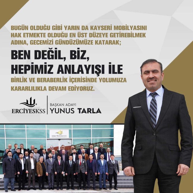 İş adamı Yunus Tarla sosyal medya hesabından ErciyesKSS Yönetim Kurulu Başkan adayı olduğunu açıkladı. Tarla yaptığı açıklamda;" Bugün olduğu gibi yarın da Kayseri mobilyasını hak etmekte olduğu en üst düzeye getirebilmek adına gecemizi gündüzümüze katarak ben değil, biz hepimiz anlayışı ile birlik ve beraberlik içerisinde yolumuza kararlılıkla devam ediyoruz." dedi.