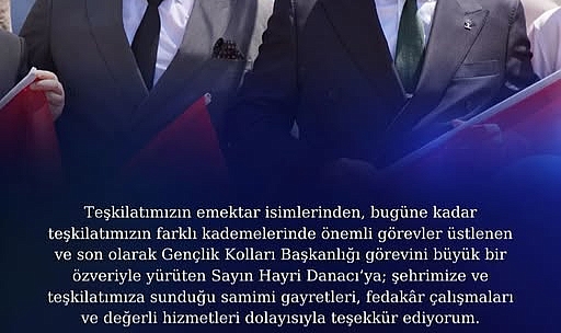 "Teşkilatımızın emektar isimlerinden, bugüne kadar teşkilatımızın farklı kademelerinde önemli görevler üstlenen ve son olarak Gençlik Kolları Başkanlığı görevini büyük bir özveriyle yürüten Sayın Hayri Danacı’ya; şehrimize ve teşkilatımıza sunduğu samimi gayretleri, fedakâr çalışmaları ve değerli hizmetleri dolayısıyla teşekkür ediyorum.