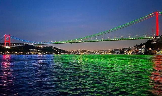 İstanbul’da köprüler, Azerbaycan’ın 28 Mayıs Bağımsızlık Günü nedeniyle Azerbaycan bayrağının renkleriyle ışıklandırıldı.