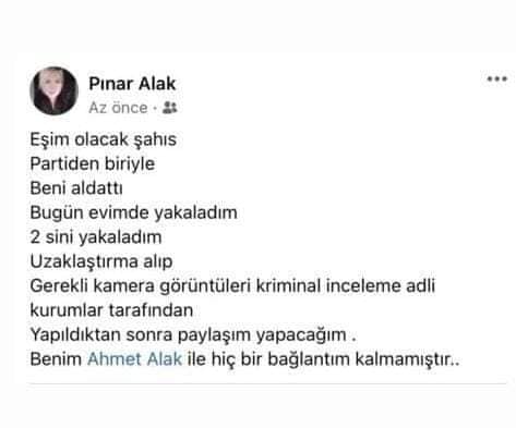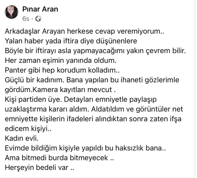 İyi Parti İncirliova İlçe Başkanı Ahmet Alak'ın eşi Pınar Alak, sosyal medya hesabından yaptığı açıklamada:" Arkadaşlar Arayan herkese cevap veremiyorum.. Yalan haber yada iftira diye düşünenlere Böyle bir iftirayı asla yapmayacağımı yakın çevrem bilir. Her zaman eşimin yanında oldum. Panter gibi hep korudum kolladım.. Güçlü bir kadınım. Bana yapılan bu ihaneti gözlerimle gördüm.Kamera kayıtları mevcut . Kişi partiden üye. Detayları emniyetle paylaşıp uzaklaştırma kararı aldım. Aldatıldım ve görüntüler net emniyette kişilerin ifadeleri alındıktan sonra zaten ifşa edicem kişiyi.. Kadın evli. Evimde bildiğim kişiyle yapıldı bu haksızlık bana.. Ama bitmedi burda bitmeyecek .. Herşeyin bedeli var" dedi.İYİ Parti İncirliova İlçe Başkanı Ahmet Alak'ndan Açıklama