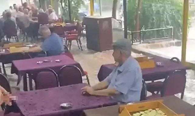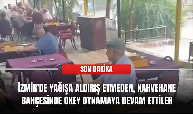 İzmir'de yağışa aldırış etmeyen kahvehane bahçesindeki bazı kişilerin okey oynamaya devam etmesi, cep telefonu kamerasıyla kaydedildi.İzmir genelinde öğleden sonra gök gürültülü yağmur başladı. Yağış günlük yaşamı olumsuz etkilerken, Konak'ın Gültepe Mahallesindeki kahvehanede bir vatandaş tarafından cep telefonuyla çekilen bir görüntü ise dikkat çekti. Görüntüde; kahvehanenin bahçesinde, yoğun yağışa rağmen bazı kişilerin okey oynamaya devam ettiği, bir vatandaşın ise sandalye üzerine çıkıp tostunu yediği anlar yer aldı.
