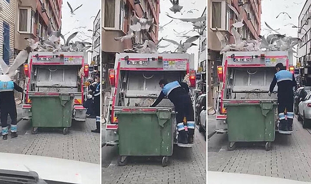 Kadıköy'de onlarca martı, çöp kamyonunun peşine takıldı. Temizlik görevlileri ise bir yandan çöpleri toplarken, bir yandan da çöpteki atıklarla peşlerinden gelen martıları besledi. O anlar cep telefonu kamerası ile görüntülendi.