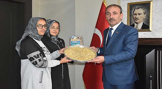 Tomarza'da faaliyet gösteren erişte işletmeciliği yapan kadın girişimciler Tomarza Belediye Başkanı Davut Şahin'i makamında ziyaret etti.