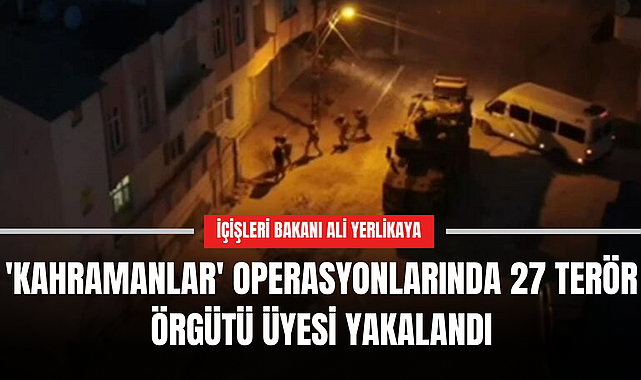 Bakan Yerlikaya, sosyal medya hesabından 'Kahramanlar' operasyonları kapsamında terörle mücadeleye yönelik 8 ilde çalışma yapıldığını duyurdu. Buna göre; Jandarma Genel Komutanlığı Terörle Mücadele Daire Başkanlığı koordinesinde, İl Jandarma Komutanlıklarınca Şanlıurfa, Mardin, Van, İzmir, Isparta, Malatya, Manisa ve Adıyaman'da düzenlenen operasyonlarda, 'terör örgütüne üye olmak', 'terör örgütüne yardım etmek', 'terör örgütüne finans sağlamak' ve 'terör örgütü propagandası yapmak' suçlarından 27 şüpheli, yakalandı. Operasyonları gerçekleştiren jandarma personelini tebrik eden Yerlikaya, "Allah ayağınıza taş değdirmesin. Son terörist etkisiz hale getirilinceye kadar mücadelemiz devam edecek" dedi.