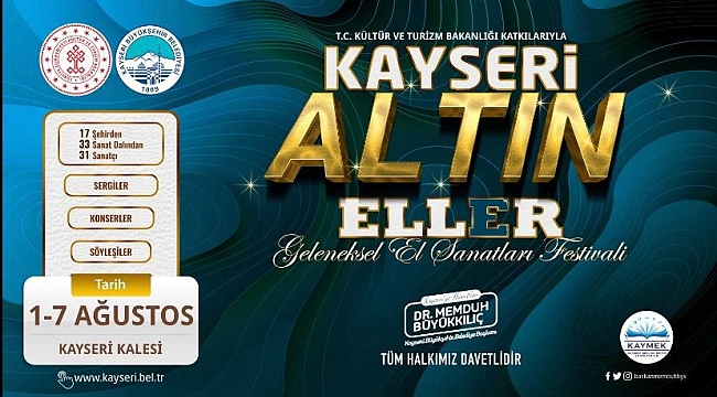 Büyükşehir Belediyesi bünyesinde faaliyet gösteren Kayseri Mesleki Eğitim ve Kültür A.Ş. (KAYMEK), Kültür ve Turizm Bakanlığı katkılarıyla 1-7 Ağustos günleri arasında Tarihi Kayseri Kalesi Kültür ve Sanat Merkezi’nde 17 şehirden 33 sanat dalının yer alacağı ve 31 sanatçının katılacağı ‘Kayseri Altın Eller Geleneksel El Sanatları Festivali’ düzenlenecek. Sergiler, söyleşiler ve konserlerin yer alacağı festivalde el sanatları da Kayserililerin beğenisine sunulacak.