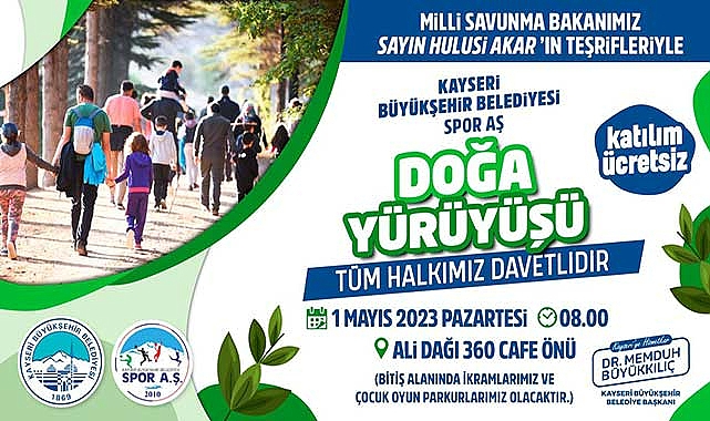 Başkan Büyükkılıç, Büyükşehir Belediyesi Spor A.Ş. tarafından organize edilecek olan Doğa Yürüyüşü’nün Ali Dağı 360 Kafe önünden başlayacağını belirterek, “Katılımın ücretsiz olacağı, Milli Savunma Bakanımız Sayın Hulusi Akar’ın da teşrif edeceği Doğa Yürüyüşü programımız 1 Mayıs Pazartesi günü saat 8.00’de başlayacaktır. Etkinliğimize tüm halkımız davetlidir” diye konuştu.