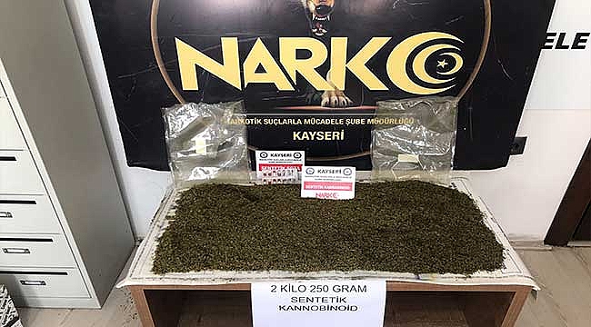 Kayseri İl Emniyet Müdürlüğü Narkotik Suçlarla Mücadele Şube Müdürlüğü ekiplerince yapılan çalışmalarda batı illerinden Kayseri’ye uyuşturucu madde getirebileceği değerlendirilmiş iki kişi otobüs ile suç unsurlarını taşırken, 3 kişi ise otomobil ile yolu kontrol ederek gelirken tespit edildi ve yapılan aramada da bebek bezlerinin içine gizlenmiş 2 kilo 250 gram sentetik kannabinoid, 7 adet sentetik ecza hap suç unsurları ele geçirildi. Olay ile ilgili 5 şüpheli ‘Uyuşturucu Madde Ticareti Yapmak’ suçundan gözaltına alındı.