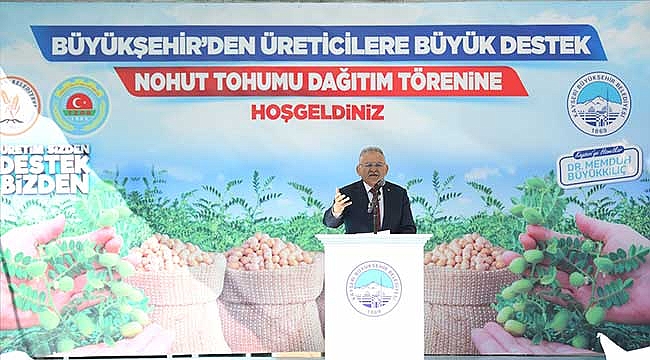 Kayseri Büyükşehir Belediyesince, üretimi desteklemek için 7 bin 500 dekar alana ekilmek üzere çiftçilere 150 ton nohut tohumu dağıtıldı.Belediyeden yapılan yazılı açıklamaya göre, Sarıoğlan ilçesinde Kayseri Büyükşehir Belediyesi Tarımsal Hizmetler Daire Başkanlığı tarafından gerçekleştirilen programa, Büyükşehir Belediye Başkanı Memduh Büyükkılıç, Sarıoğlan Kaymakamı Hatice Ruveyda Kahraman, Akkışla Kaymakamı Tarık Safa Kahveci, Sarıoğlan Belediye Başkanı Bekir Ayyıldırım, Akkışla Belediye Başkanı Ayhan Arslan, Kayseri İl Tarım ve Orman Müdürü Mustafa Şahin, Büyükşehir Belediyesi Genel Sekreter Yardımcısı Bayar Özsoy, Tarımsal Hizmetler Daire Başkanı Duran Safrantı, ziraat odası temsilcileri ve çiftçiler katıldı.Programda konuşan Büyükkılıç, tarım ve hayvancılık alanında üretime önem verdiklerini belirtti.Pilot bölge seçilen Sarıoğlan ilçesinde uygulanan üreticiye tohum desteği projesi kapsamında 150 ton azkan cinsi nohut dağıttıklarını aktaran Büyükkılıç, şunları kaydetti:"Pandemi döneminde de gördük ki, özellikle savaşlarda da görüyoruz ki bir ülkenin kendi kendine yeter olması lazım. Savunma sanayinde de tarımında da ziraatında da hayvancılığında da ekonomisinde de kendi kendine yetmesi lazım. Elden gelen öğün olmaz, o da zamanında bulunmaz. Onun için biz birbirimize yeteriz diyeceğiz. Birbirimize sahip çıkacağız, imkanlarımızı seferber edeceğiz. Tarıma, hayvancılığa, üretime özel önem vermemiz gerekir. Bunun için çiftçi kardeşlerimizi, üretici kardeşlerimizi bağrımıza basıyoruz. Bir proje bağlamında bunu Sarıoğlan’dan başlattık. Elbette diğer ilçelerimize de inşallah yapacağımızdan hiç kaygınız olmasın."