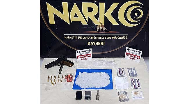 Araçta yapılan aramada, 108 gram sentetik uyuşturucu, 2 gram eroin, hassas terazi, 26 uyuşturucu hap, uyuşturucu tartımında kullanılan ölçek kaşık, ruhsatsız tabanca ve 13 fişek ele geçirildi.