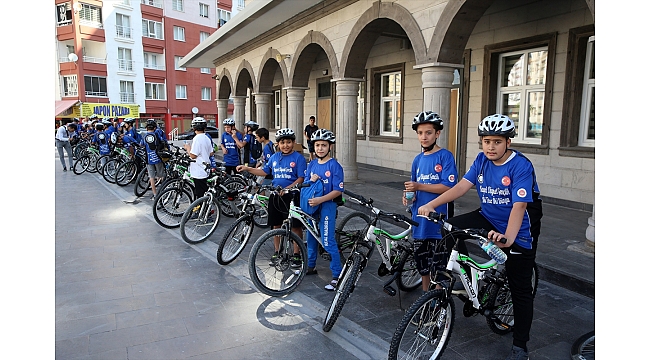 Talas Müftülüğü tarafından düzenlenen "Gençler Tarihe Pedallıyor" projesi kapsamında Halil Bayraktar Camii önünde bir araya gelen 40 genç, Osmanlı Sokağı ve eski Talas gibi ilçenin tarihi yerlerini bisikletle gezdi.