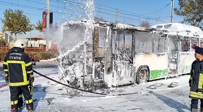 Kayseri'de seyir halindeyken alev alan özel halk otobüsü yanarak kullanılamaz hale geldi.