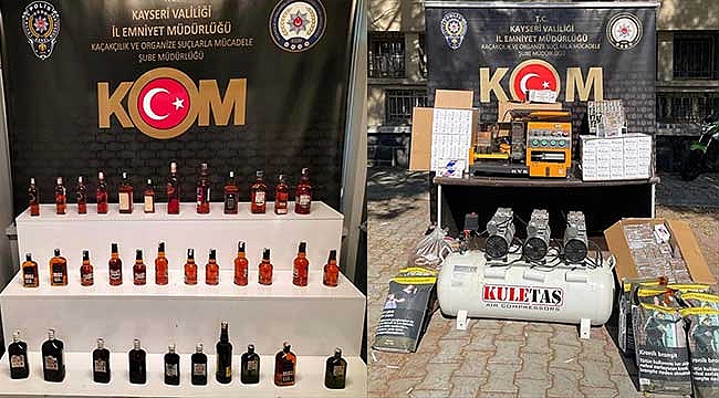 Kayseri'de sahte alkol, makaron, kaçak sigara, cep telefonu ve ruhsatsız tabanca ele geçirildi.