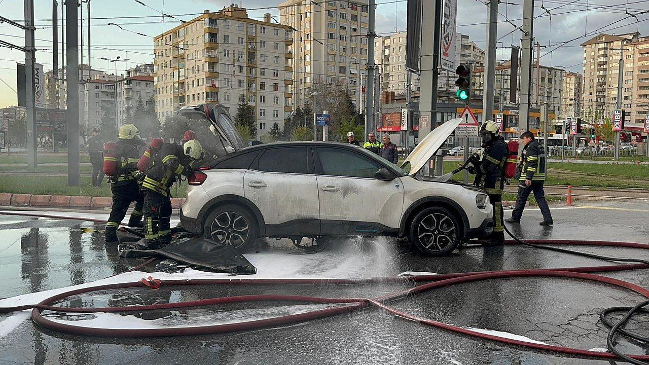 Kayseri’de, seyir halindeki elektrikli otomobil henüz bilinmeyen bir nedenle alev aldı. Yangın itfaiyenin uzun süren çalışması sonucu söndürüld