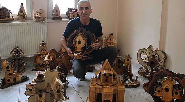 - "Amacım insanlar çevreye karşı duyarlı olsun, çevreyi korusun. İnsanlara bir şekilde dokunmak gerekiyor"Kayseri'de tarih öğretmeni Cuma Atılgan, kütük ve tahta parçalarını kullanarak kuşlar için özel evler üretiyor.Yaklaşık 32 yıldır öğretmenlik yapan 59 yaşındaki Atılgan, ilk kuş evini 2003'te kızının isteği üzerine sokaktan topladığı dondurma çubuklarıyla yaptı.Evinin müsait olmaması sebebiyle kuş evi yapımına ara veren Atılgan, daha sonra 2019'da TEMA Vakfı'nın "Kuşlar Yuvasız Kalmasın" projesine destek amacıyla yeniden kuşlar için yuvalar tasarlamaya başladı.Atılgan, kuş evi yapmak için ilk olarak oduncudan kütük ve ağaç, marangozdan ise ince tahta parçaları alıyor.Daha sonra bu parçaları atölye olarak kullandığı binanın görevli dairesine götüren Atılgan, birbirinden farklı özel kuş evleri yapıyor.Kuş evlerini ağaçlara asan Atılgan, dostlarına da hediye ediyor.Seyide Daloğlu Anadolu Lisesi tarih öğretmeni Atılgan, AA muhabirine, Osmanlı dönemindeki kuş evlerinden esinlendiğini söyledi.Yuvaları tasarlamadan önce araştırma yaptığını belirten Atılgan, "Türkiye'nin değişik camilerinde ve medreselerinde bu tür kuş evleri var. Kayseri'de ise Cumhuriyet Mahallesi'nde bir çeşmenin üzerinde var." dedi.Sıradan kuş evlerinin yanı sıra yaklaşık 80 özel tasarım yaptığını anlatan Atılgan, şöyle devam etti:"Bunlara bakıldığında kuş evinden ziyade tablo veya sanat eseri gibi gözüküyor. El testeresi, matkap, tornavida ve yapıştırıcıyla şekillendiriyorum. Yüzeye yapılacak kütükle zemindeki kütüğün uyumlu olması gerekiyor. O aşamadan sonra tasarlıyorum ve yapmaya başlıyorum. Yuvaların şekilleri birbirine benzemiyor. Doğaya yaklaşık 15 standart kuş evi bıraktım, arkadaşlarıma da çok sayıda hediye verdim. Para karşılığı yapmıyorum."-"İnsanlara bir şekilde dokunmak gerekiyor"Atılgan, yaptığı kuş evlerini zaman zaman okula götürdüğünü dile getirerek, "Sınıflarda öğrencilere gösteriyorum. Onları teşvik ediyorum. Bazen de 5-6 tane götürüp okulda sergiliyorum. Amacım insanlar çevreye karşı duyarlı olsun, çevreyi korusun. Boş vakitlerimin neredeyse tamamını öğrencilere ayırıyorum. İnsanlara bir şekilde dokunmak gerekiyor. Eğitimin her yerde olması gerekiyor. İnsanlar yaşadığı çevreyi kesinlikle fark etmeli, tanımalı ve korumalı." diye konuştu.Atılgan, Kayseri'de kuş evi müzesi açılmasını istediğini sözlerine ekledi.