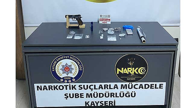 Adreste ve bir otomobilde yapılan aramada, 30 gram metamfetamin, uyuşturucu hap, hassas terazi, ruhsatsız tabanca ele geçirildi.