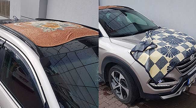Kayseri’de dün etkili sağanak yağmur ve dolu nedeniyle bazı otomobil sahipleri araçlarının zarar görmemesi için kaporta ve tavan kısmına battaniye ve örtü sererek araçlarını korumaya çalıştı.