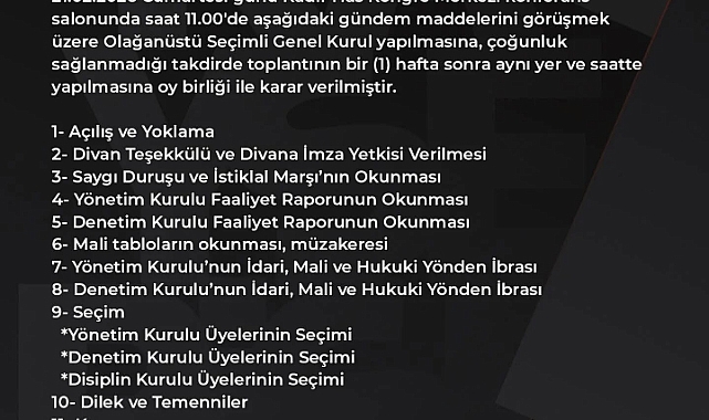 Kayserispor'dan yapılan yazılı açıklamada, kulubün 21 Şubat'ta olağanüstü genel kurula gideceği duyuruldu. Kulubün yaptığı açıklamada şu ifadelere yer verildi; "Yönetim kurulumuz başkan ve üyelerin iştiraki ile toplanarak 21.02.2026 cumartesi günü Kadir Has Kongre Merkezi konferans salonunda saat 11.00'de Olağanüstü Seçimli Genel Kurul yapılmasına, çoğunluk sağlanmadığı takdirde toplantının 1 hafta sonra aynı yer ve saatte yapılmasına oy birliği ile karar verilmiştir"