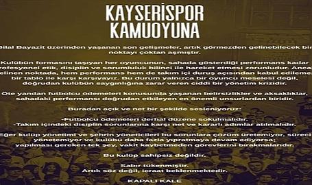 SÜPER Lig ekiplerinden Zecorner Kayserispor'un taraftar grubu Kapalı Kale yazılı açıklama yaparak, sarı-kırmızılı yönetiminin takım içindeki disiplin sorunlarına karşı adımlar atmasını istedi. Açıklamada, "Eğer kulüp yönetimi ve şehrin yöneticileri bu sorunlara çözüm üretemiyor, süreci yönetemiyor ve kulübü daha fazla yıpratmaya devam ediyorsa; yapılması gereken tek şey, vakit kaybetmeden görevlerini bırakmalarıdır. Bu kulüp sahipsiz değildir. Sabır tükenmiştir" denildi.Süper Lig'in 29'uncu haftasında sahasında Fenerbahçe'yi konuk edecek Zecorner Kayserispor'da zorlu karşılaşma öncesi İç Anadolu ekibinin taraftar grubu Kapalı Kale yazılı bir açıklama yaparak, sarı-kırmızılı takımın yöneticilerine çağrı yaptı. Futbolcu ödemelerinin düzene sokulması ve takım içi disiplinin sağlanması gerektiğine vurgu yapılan açıklamada şu ifadelere yer verildi:"Büyük Kayserispor Kamuoyuna! Bilal Bayazit üzerinden yaşanan son gelişmeler, artık görmezden gelinebilecek bir noktayı çoktan aşmıştır. Kulübün formasını taşıyan her oyuncunun, sahada gösterdiği performans kadar profesyonel etik, disiplin ve sorumluluk bilinci ile hareket etmesi zorunludur. Ancak gelinen noktada, hem performans hem de takım içi duruş açısından kabul edilemez bir tablo ile karşı karşıyayız. Bu durum yalnızca bir oyuncu meselesi değil, doğrudan kulübün saygınlığına zarar veren ciddi bir yönetim krizidir. Öte yandan futbolcu ödemeleri konusunda yaşanan belirsizlikler ve aksaklıklar, sahadaki performansı doğrudan etkileyen en önemli unsurlardan biridir. Buradan açık ve net bir şekilde sesleniyoruz: Futbolcu ödemeleri derhal düzene sokulmalıdır. Takım içindeki disiplin sorunlarına karşı net ve kararlı adımlar atılmalıdır. Eğer kulüp yönetimi ve şehrin yöneticileri bu sorunlara çözüm üretemiyor, süreci yönetemiyor ve kulübü daha fazla yıpratmaya devam ediyorsa; yapılması gereken tek şey, vakit kaybetmeden görevlerini bırakmalarıdır. Bu kulüp sahipsiz değildir. Sabır tükenmiştir. Artık söz değil, icraat beklenmektedir."