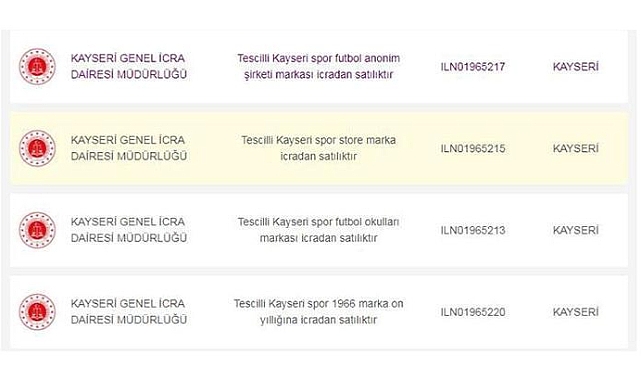Süper Lig'de son yıllarda mali anlamda zor günler geçiren Kayserispor'da, icra dairesi üzerinden verilen resmi ilan ile kulübün 'Kayserispor 1966', 'Kayserispor Futbol Anonim Şirketi' ismi ile 'Kayserispor Store' ve 'Kayserispor Futbol Okulları' ismi satışa çıkarıldı. 'Kayserispor 1966' için muhammen bedel 40 milyon TL olurken, 'Kayserispor Futbol Anonim Şirketi' için belirlenen muhammen bedel 35 milyon TL, KayserisporStore için 4 milyon TL, Kayserispor Okulları için ise, 8 milyon TL muhammen bedel belirlendi. İlan.gov.tr üzerinden gerçekleştirilecek olan icra satışı 20 Şubat 2024 tarihinde saat 14.41’de başlayacak ve 27 Şubat saat 14.41’de sona erecek. Teklifler online olarak verilecek. Bu tarihler arasında satış gerçekleşmezse ikinci satış ihalesi 14 Mart’ta başlayacak ve 21 Mart tarihine kadar tekliflere açık olacak.